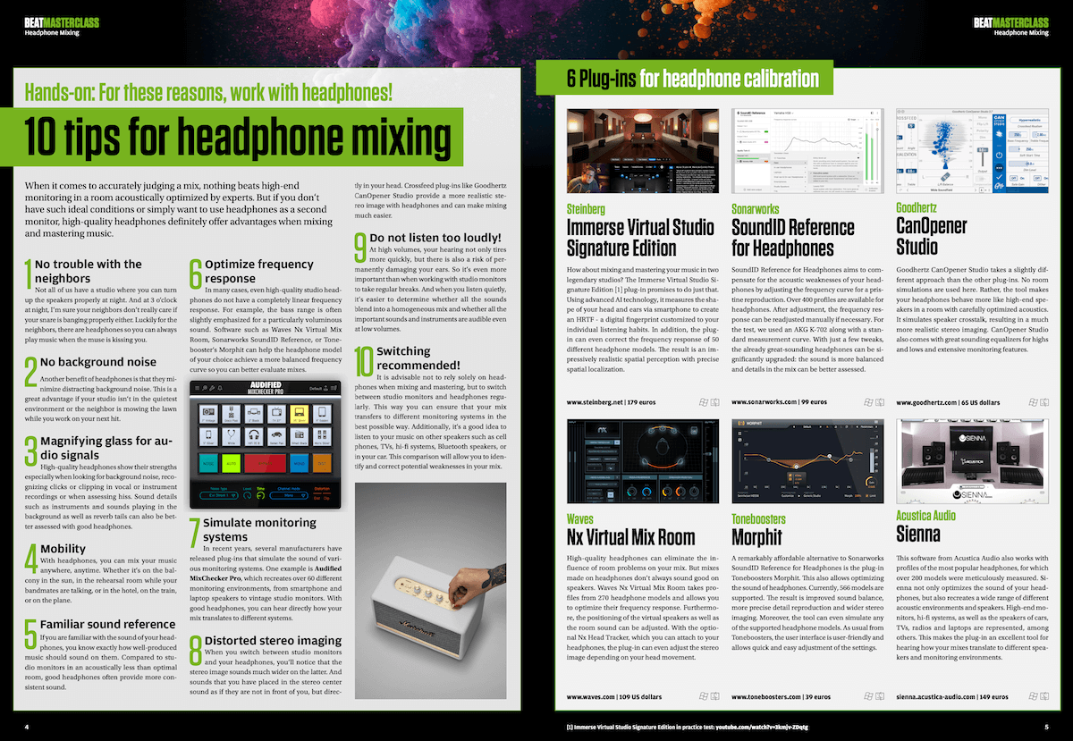 Not everyone has enough space in the studio for large speakers and correct placement. Besides, even the best monitoring system is useless if the acoustics aren‘t right. So why not mix with headphones? We‘ll show you which models are best for you and your sound, what to look for when buying them, and give you all the advantages for headphone mixdowns to give your tracks the final touch. Also included: a market overview with technical data and applications for all important and current headphones.