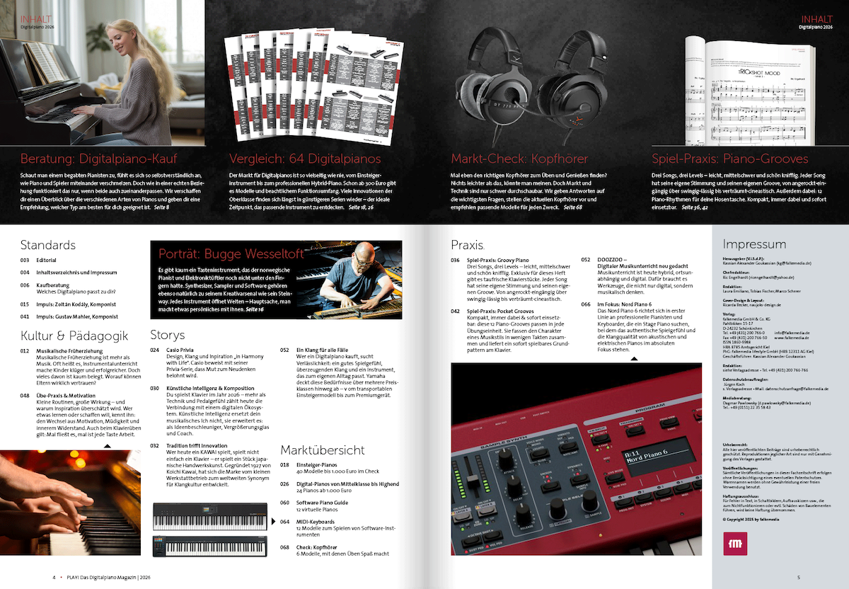 In diesem 72-seitigen Sonderheft findest du alles, was du für den Einstieg oder die Vertiefung in die Welt der Digitalpianos brauchst. Es ist mehr als nur eine Übersicht – es ist eine Inspirationsquelle, die von Experten wie Ric Engelhardt, studiertem Pianisten und Chefredakteur, kuratiert wurde.